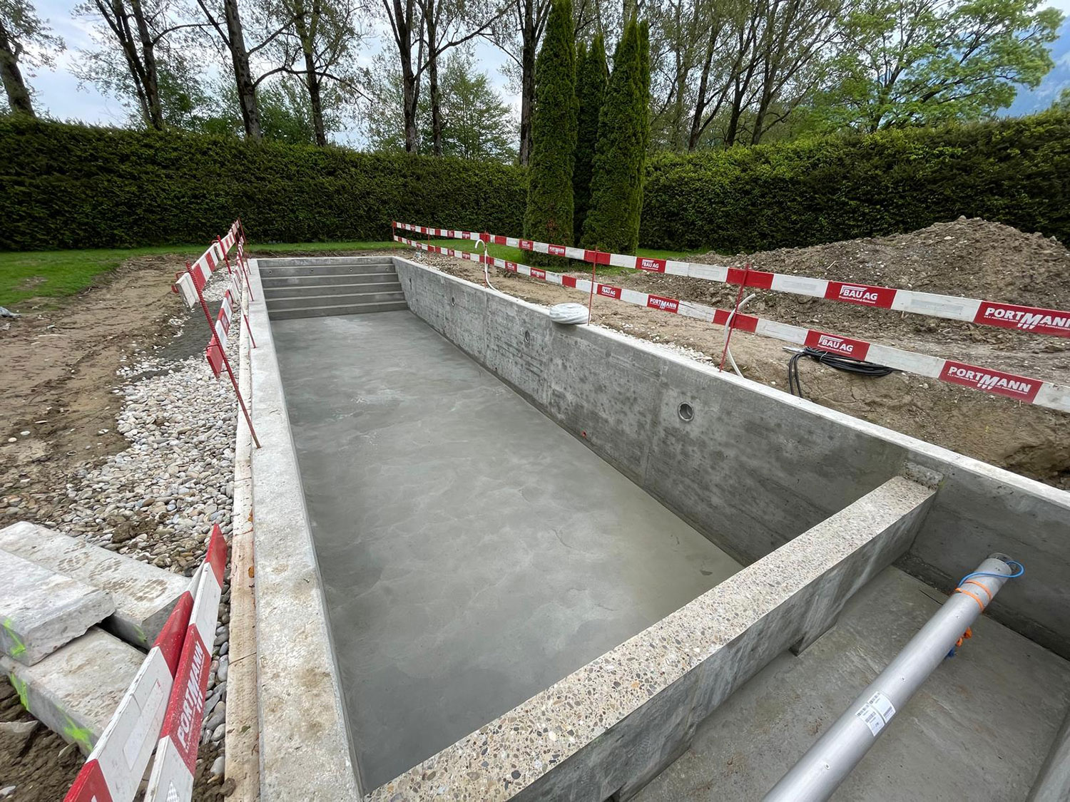 Ein Betonpool ist eine bewährte Art, ein Schwimmbad zu bauen. Durch diese Art von Bau stehen Ihnen unzählige Möglichkeiten offen, Ihren Traum vom Schwimmbad zu realisieren. Beton ist ein bodenständiges, langlebiges Baumaterial, welches im Schwimmbadbereich oft eingesetzt wird. Ein Betonpool ist extrem vielseitig, nicht nur als Sichtbetonbecken, sondern auch mit  Folie, GFK-Beschichtung oder Fliesen auszustatten.