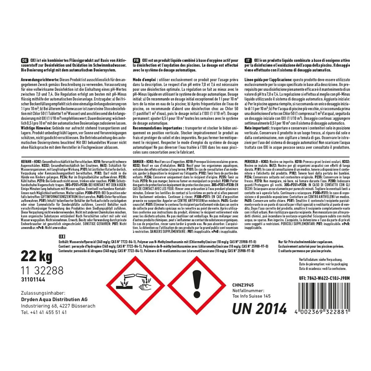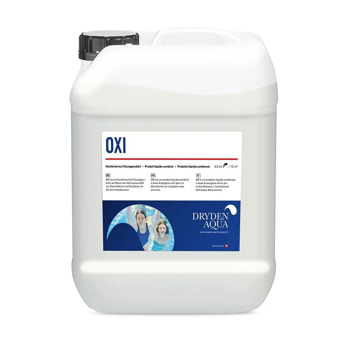 Oxi ist ein kombiniertes Flüssigprodukt auf Basis von Aktivsauerstoff zur Desinfektion und Oxidation im Schwimmbadwasser. Die Dosierung erfolgt mit einem automatischen Dosiersystem.